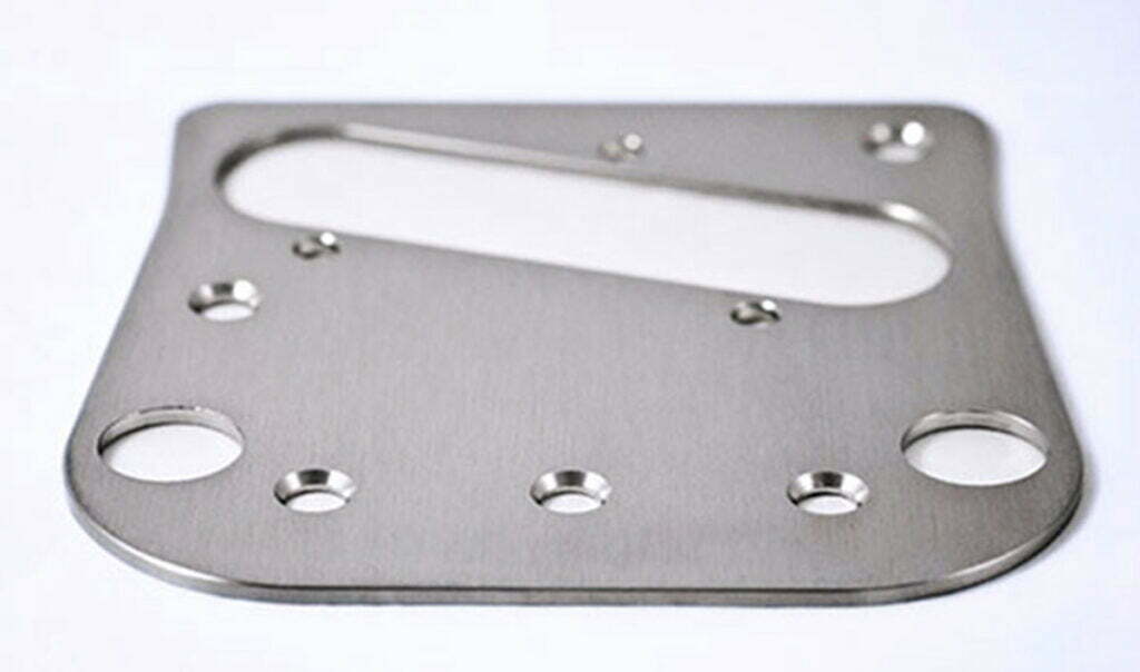 Decorative Tele plate for Bigsby B5 users in hand straight-line sanded solid stainless steel. Standard vintage footprint. A beautiful match with our M1 bridge and Bigsby B5. Engraved Mastery logo is hidden underneath.