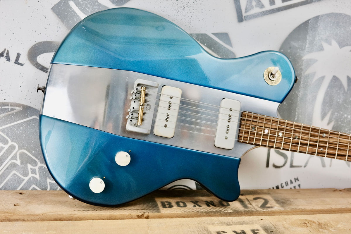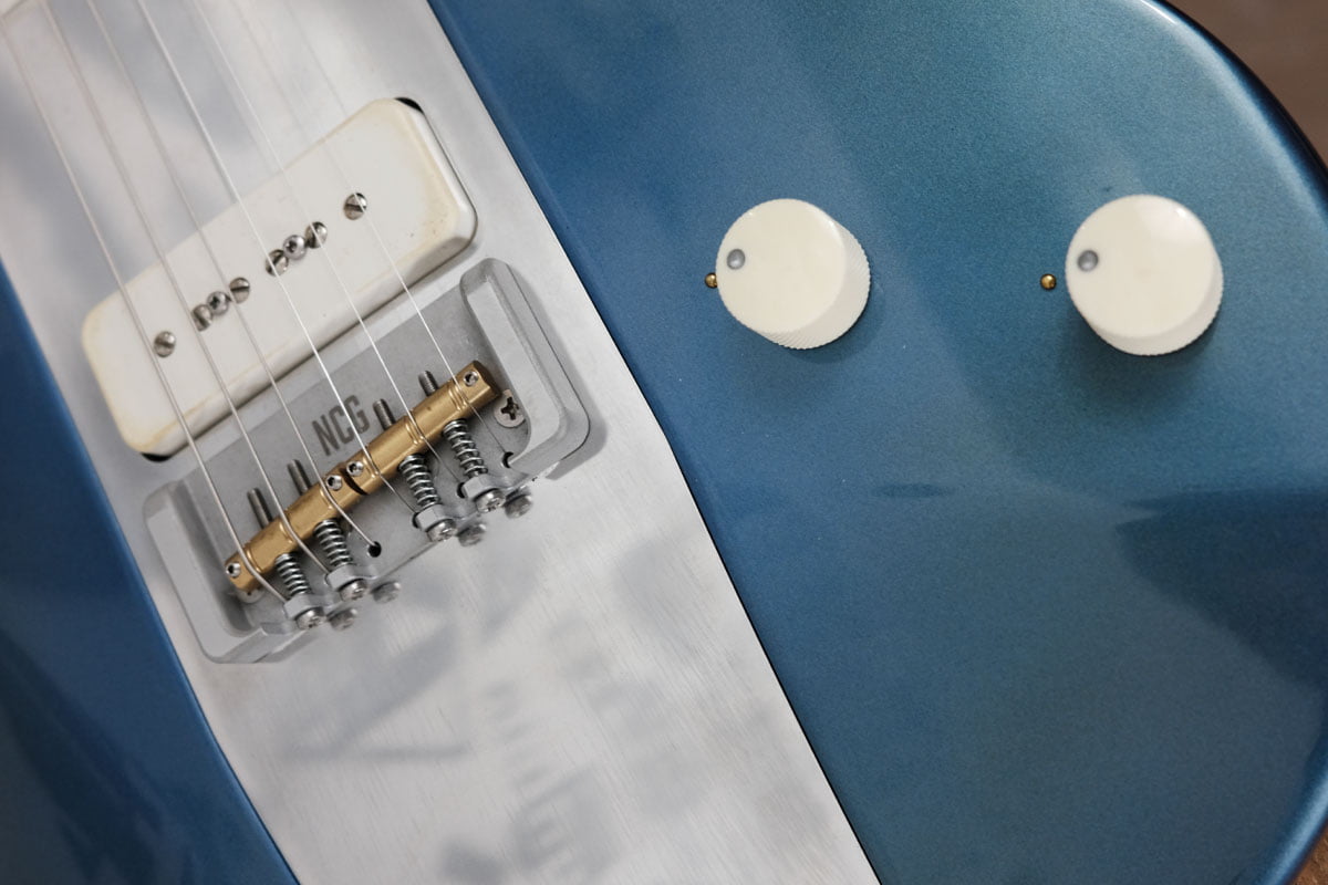 Hybrid aircraft grade 6082 aluminium & ash body shells. 25.5” scale length C profile Maple neck, Zebrano fingerboard, 12” radius. 22 frets, Evo Gold 47095, bone nut, abalone dots. Two way truss rod. Aged Lake Placid Blue nitro’ lacquer to wood body. Clear nitro’ to headstock & neck. Kluson tuners. Bare Knuckle Blue Note 90 pickups, Haramis knobs & switch tip. CTS pots, Switchcraft toggle switch & jack. NCG hardware & alloy bridge. Weighs 8 lb 5 oz.